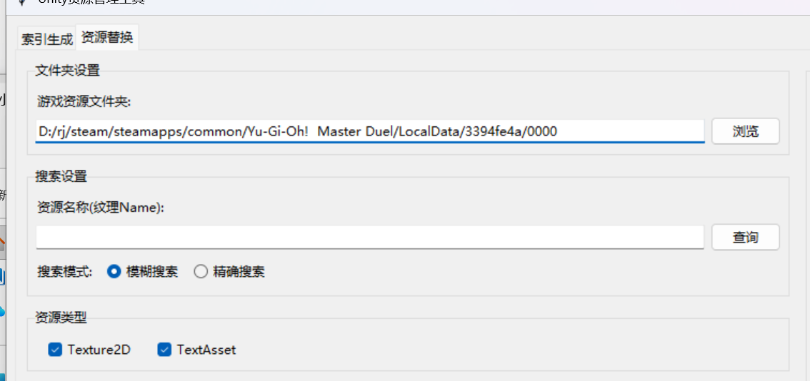第一次使用需要先进行索引生成,在选择文件夹里选择自己的游戏账号下的0000文件夹位置,如steam/steamapps/common/Yu-Gi-Oh! Master Duel/LocalData/3394fe4a(这里每个人账号不同数字也不同)/0000,选择普通模式,点击左下角的开始生成索引后等待日志出现索引生成完毕