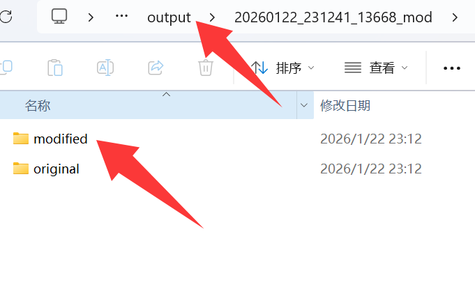 mod生成默认在output文件夹里,按时间找modified文件夹里的就是修改好的文件,可以直接替换md的同名文件检查修改,如果有错误original是原本的文件可以换回去