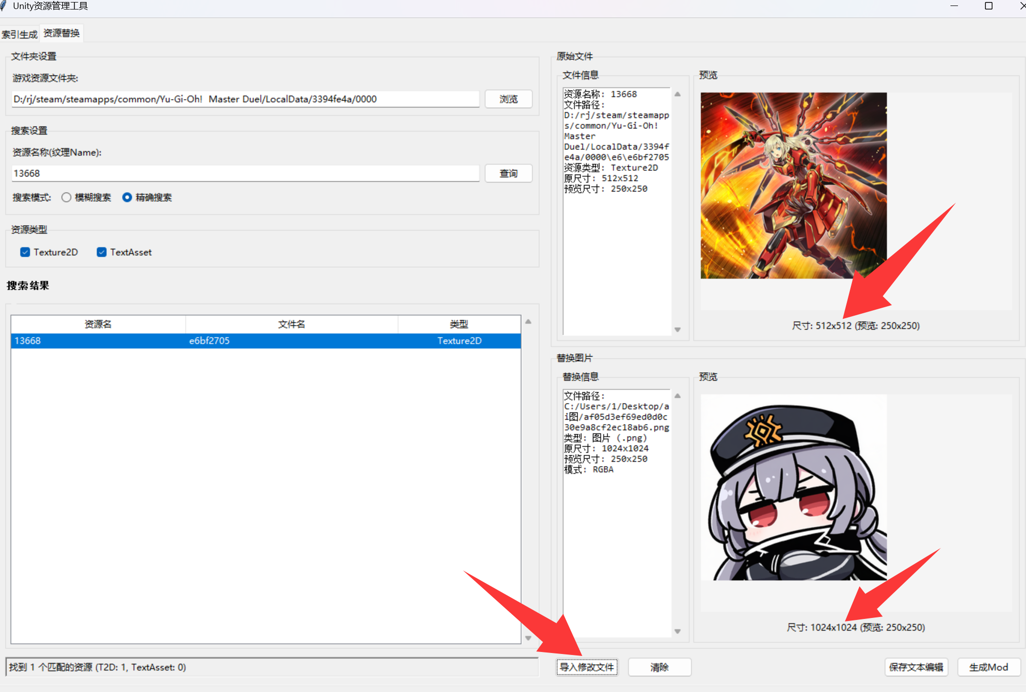 如果只是修改卡图,那我推荐点精准搜索,搜出来就只有一个就是了,点一下右边会有预览,点击导入修改文件能选择图片进行修改了(注意要保证两张图的尺寸相同,卡图就是512x512,需要调整一下大小),对比没问题就点生成mod