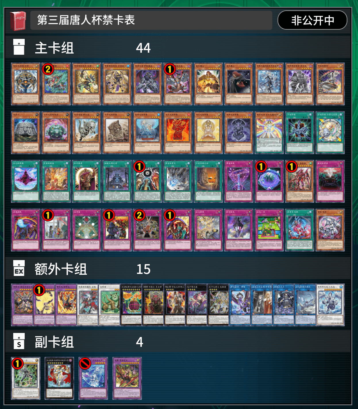 唐人杯禁卡表限制了游戏王全体手坑,禁止非卡组本家类型的泛用康,以及在禁卡表内的封锁怪兽与贴纸(让对方无法发动效果/效果发动无效化,无法特殊召唤/召唤)以及削手这种不让群友玩游戏王的卡片,请自觉放弃。