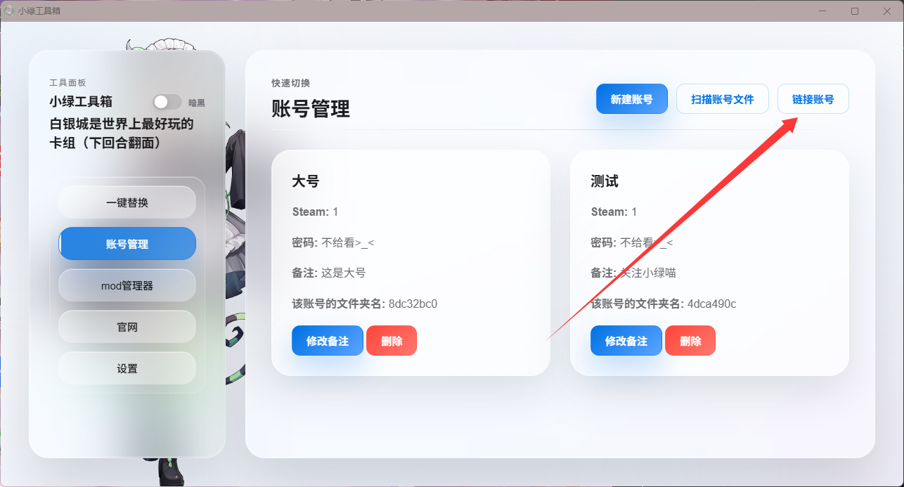 此功能链接的账户无需再次打开管理器切号即可随意切换steam号游玩,